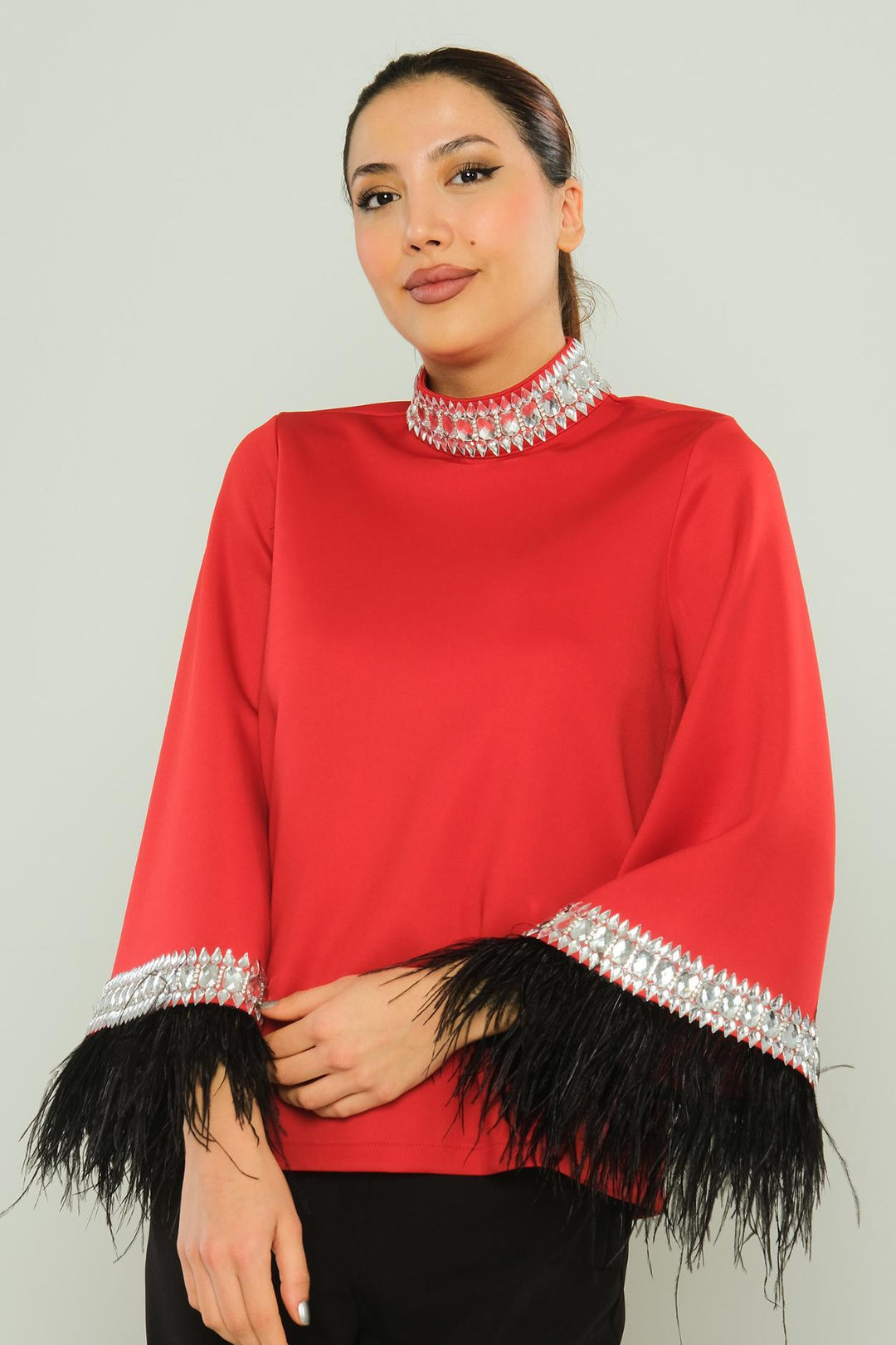 WOMEN'S DRESSY RHINESTONE BEADED NECK TOPS. BLACK, RED, LEOPARD PRINT
